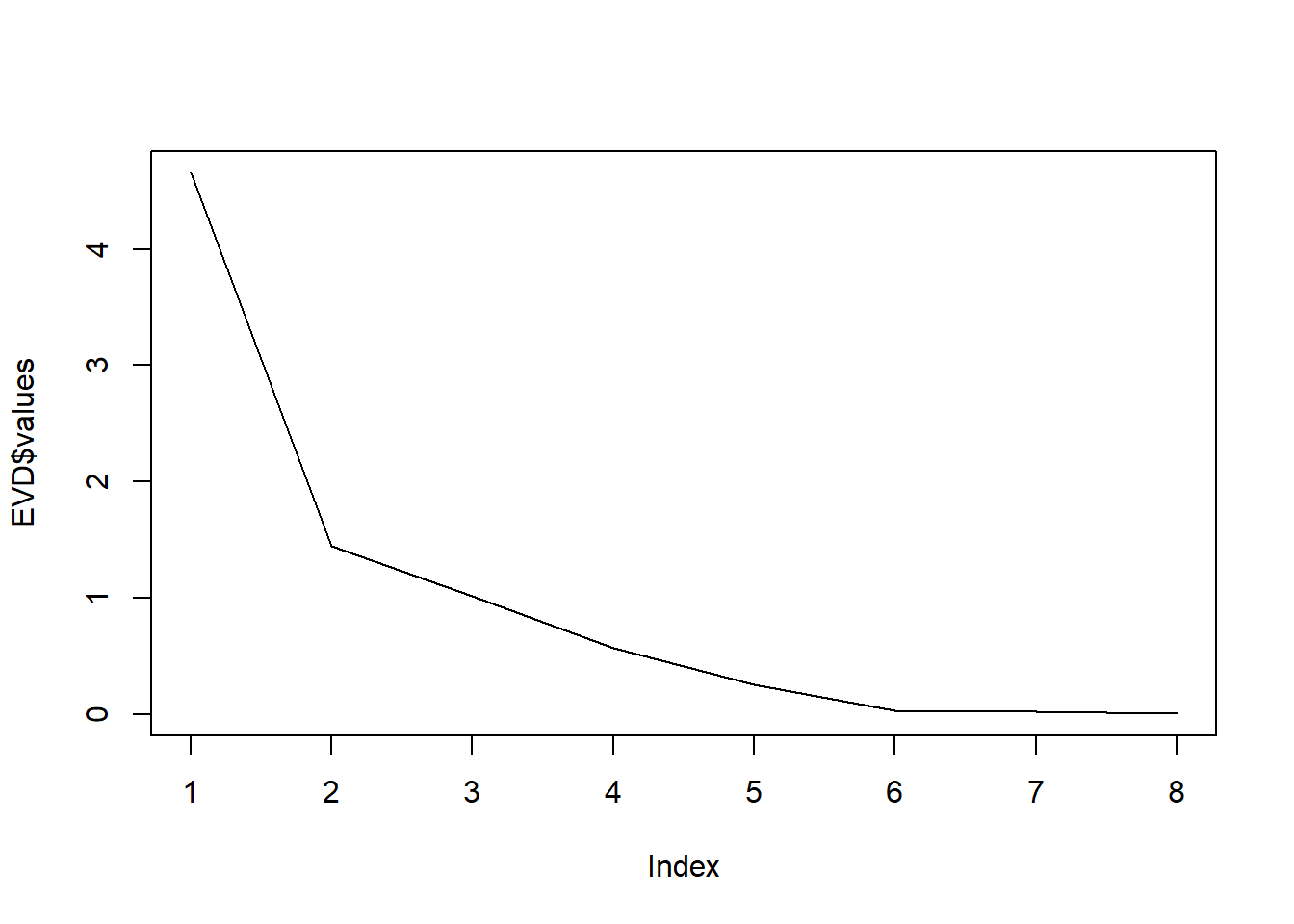 round(EVD$values, 2)[1] 4.65 1.45 1.01 0.57 0.25 0.03 0.02 0.00