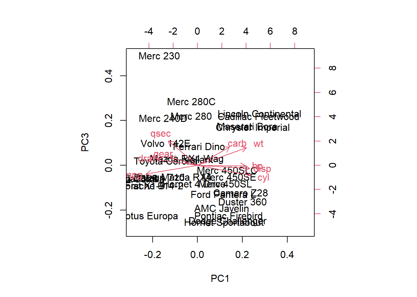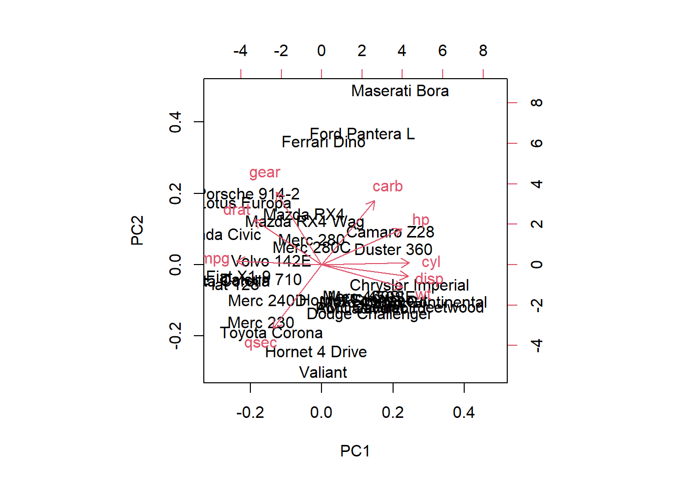 The axes of the biplot are seen as arrows originating from the center point. Here, you see that the variables hp, cyl, and disp all contribute to PC1, with higher values in those variables moving the observations to the right on this plot. This lets you see how the car models relate to the axes. You can also see which cars are similar to one another. For example, the Maserati Bora, Ferrari Dino and Ford Pantera L all cluster together at the top. This makes sense, as all of these are sports cars.