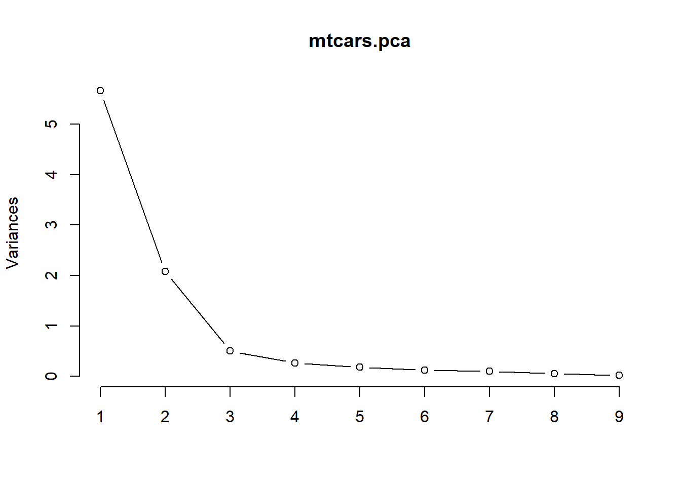 round(mtcars.pca$sdev^2, 3)[1] 5.656 2.082 0.504 0.265 0.183 0.124 0.105 0.059 0.022