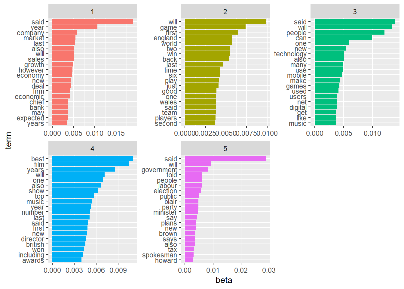 # Words with the greatest difference in beta between topic 2 and topic 1