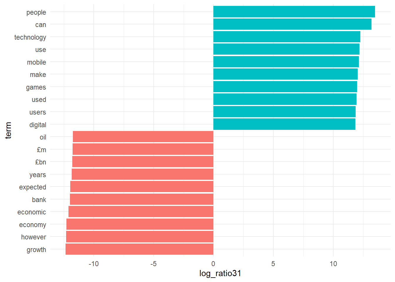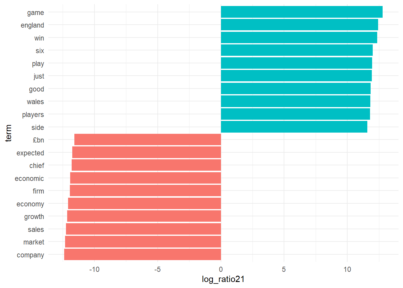 lda_top_terms12$term <- factor(lda_top_terms12$term, levels = lda_top_terms12$term[order(lda_top_terms12$log_ratio21)])