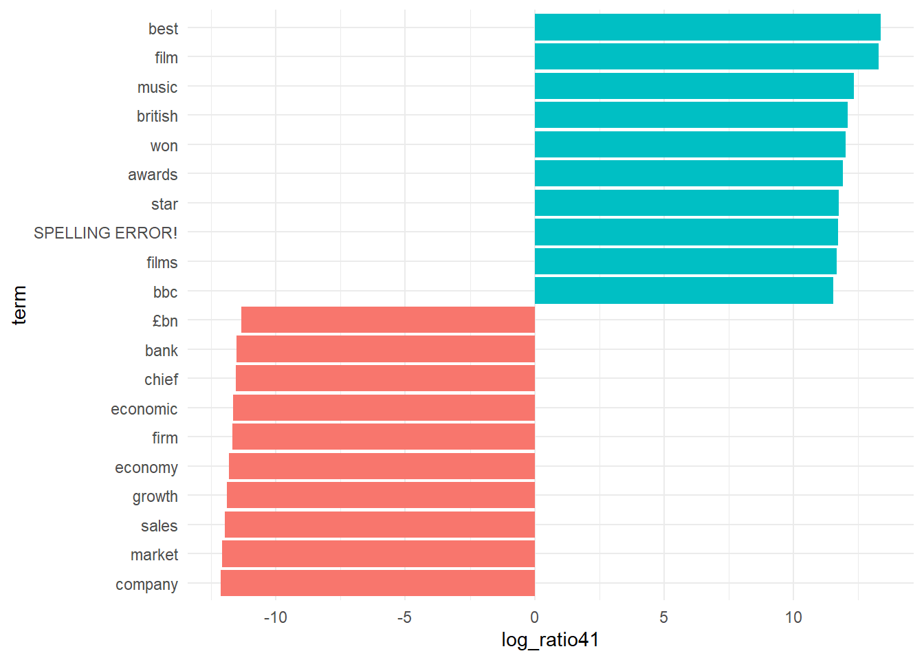 lda_top_terms14$term <- factor(lda_top_terms14$term, levels = lda_top_terms14$term[order(lda_top_terms14$log_ratio41)])