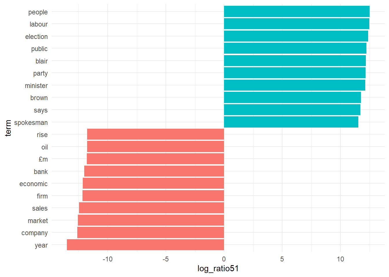 lda_top_terms15$term <- factor(lda_top_terms15$term, levels = lda_top_terms15$term[order(lda_top_terms15$log_ratio51)])